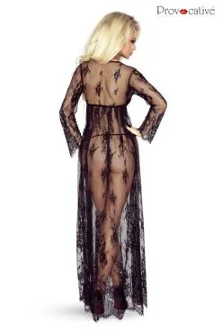 Déshabillé Long Transparent Noir Micro Résille Noué Doré