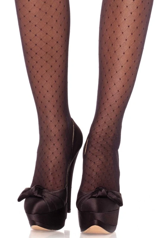 Ravissante paire de bas Ă l’effet point de croix (petits pois quadrillĂ©s). Les jarretières sont en jolie dentelle florale avec bande silicone autofixante. Bon confort et maintien.