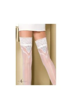 Bas blancs en Lycra 20 deniers, soulignĂ©s derrière par une couture fantaisie enrichie d’un fil d’argent Lurex.