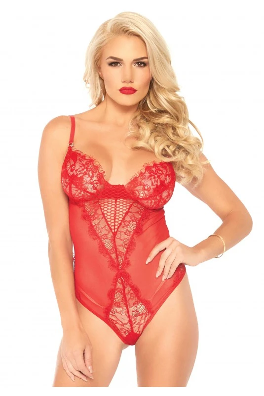 Body String Rouge Echancré Dentelle Et Sa Jupe Maille Transparente Amovible Grande Taille