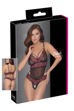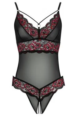 Body String Rouge Echancré Dentelle Et Sa Jupe Maille Transparente Amovible Grande Taille
