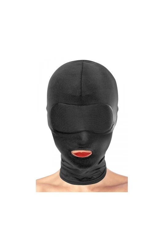 Cagoule fetish en spandex, avec ouverture au niveau de la bouche pour laisser votre soumis(e) s’exprimer et vous gâter.