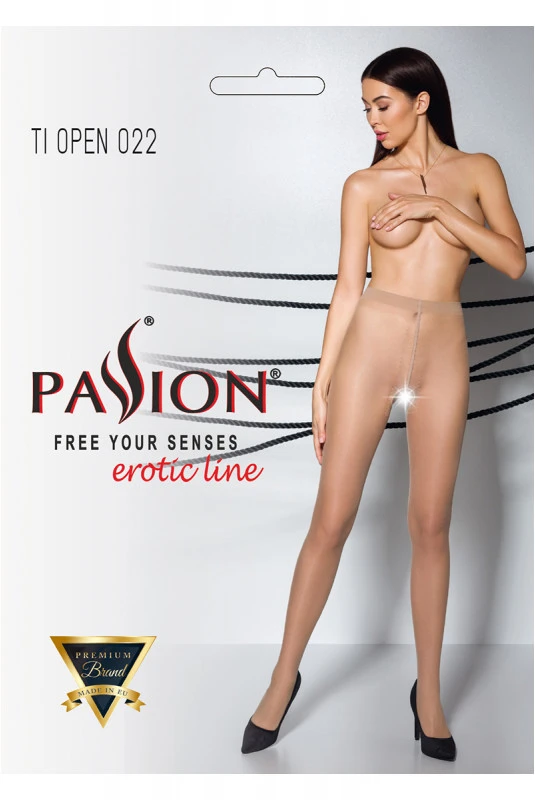 Paire de collants ouverts en voile beige 20 deniers, dĂ©corĂ©s d’une fine couture noire sur tout l’arrière de la jambe.