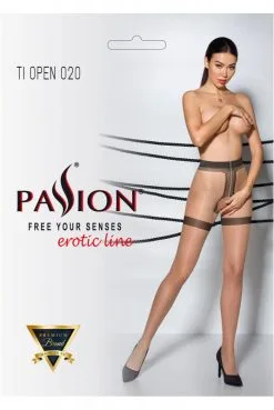 Paire de collants ouverts bicolores en voile beige, soulignés de noir aux jarretières et à la ceinture.