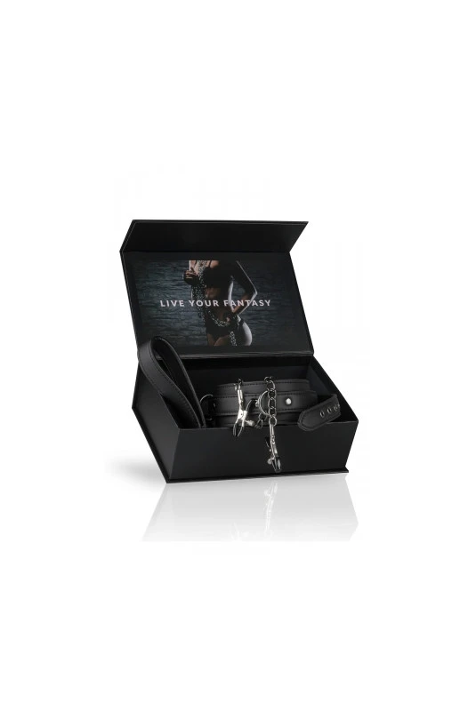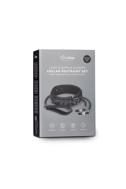 Collier BDSM de qualité, en cuir, avec laisse, chaînes métalliques et pinces pour les mamelons.