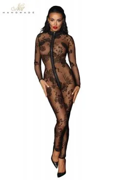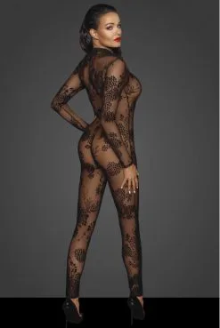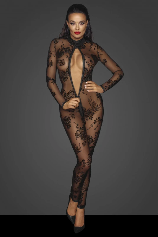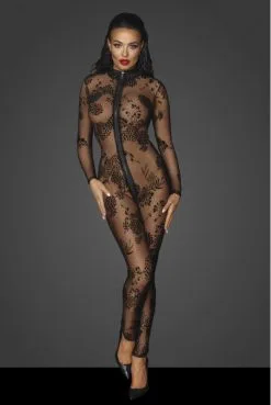 Combinaison intégrale totalement transparente en tulle floqué de motifs de fleurs, et ouverture triple zip.