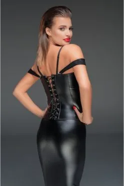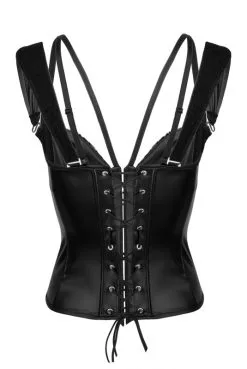 Véritable corset en wetlook et dentelle, structuré par des tiges, fermé devant par des crochets chromés et lacé dans le dos.