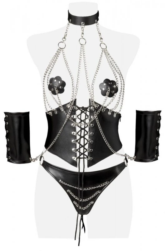 4 pièces : 1 corset avec collier de soumission, 1 paire de cache-tétons, 1 paire de manchettes, 1 string.