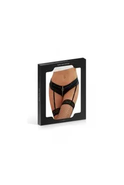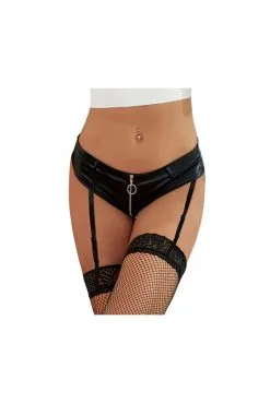 Culotte / mini shorty Ă jarretelles en simili cuir avec fermeture zippĂ©e de l’avant Ă l’arrière.