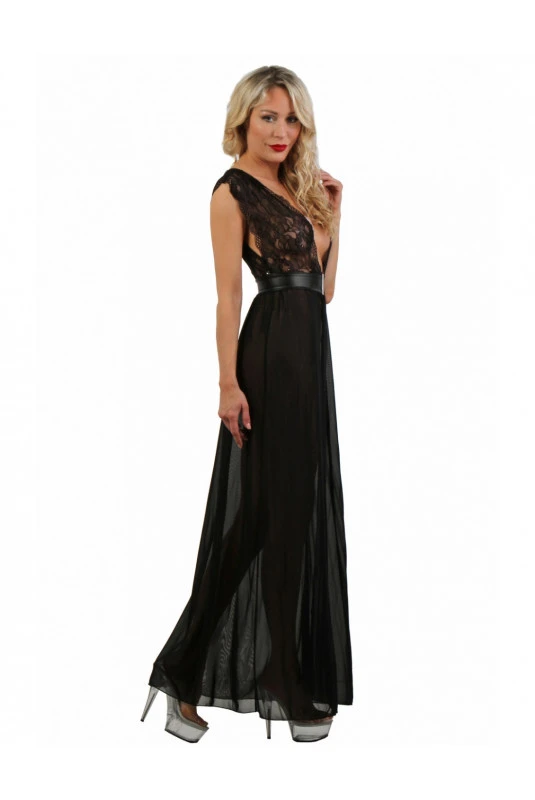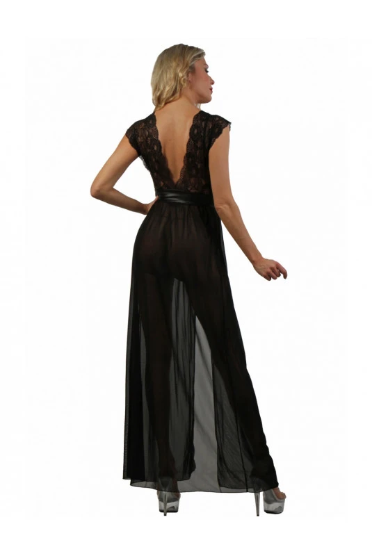 Déshabillé Long Noir Micro Résille Dentelle Bijou