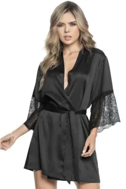 Déshabillé Peignoir Satin Noir Manche Dentelle