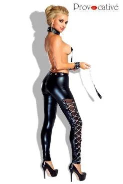 Ensemble collier, menottes et laisse en cuir clouté avec bijou au collier. Relié par une chaine et mousquetons.
