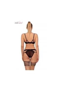 Ensemble de lingerie en tulle noir, soutien-gorge brassière et culotte avec harnais jarretières intégré.