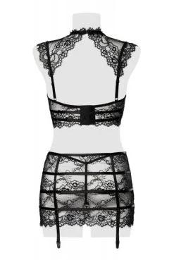 Ensemble clubwear libertin raffiné en dentelle avec quatre jarretelles, rehaussé de harnais sur le décolleté et les hanches.