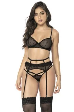 Ensemble Libertin 3 Pièces Soutien-Gorge Résille Porte-Jarretelles String Noir