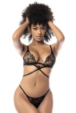 Ensemble lingerie deux pièces noirs avec soutien-gorge dentelle et string assorti.