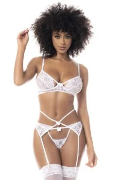 Ensemble blanc trois pièces lingerie sexy, soutien-gorge, string et porte jarretelles.