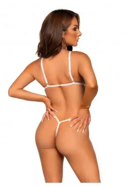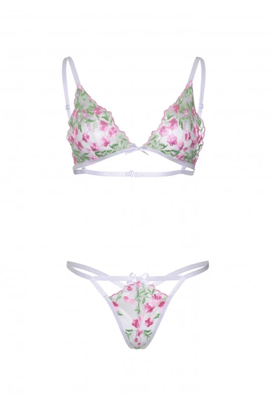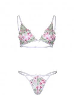 Ensemble Sexy Chic Soutien Gorge Transparent String Brodés Fleurs Blanc