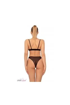 Ensemble de lingerie en tulle noire soutien-gorge et string avec jarretelles intégrées pour fixer des bas.