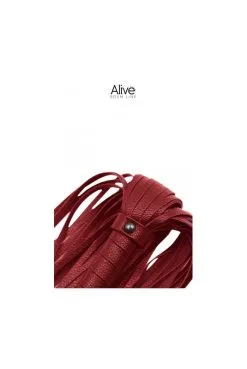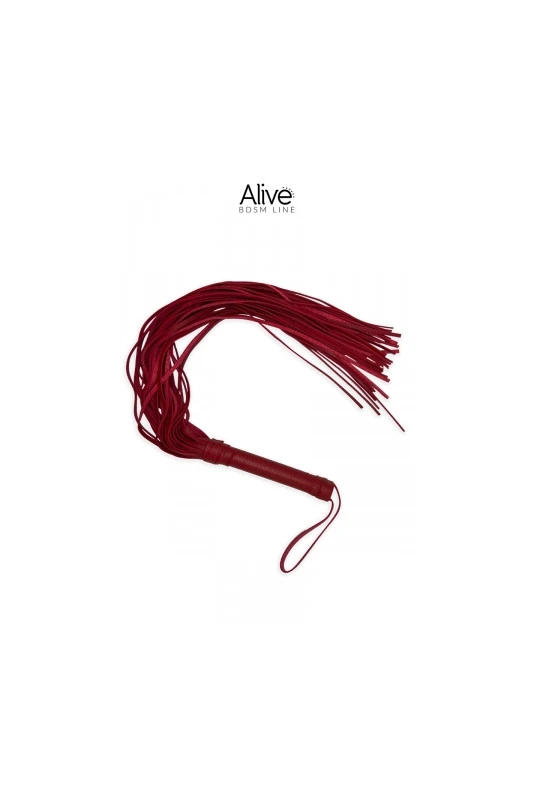 Long Fouet rouge à plusieurs lanières en cuir synthétique, idéal pour administrer de douces caresses ou des punitions plus sévères.