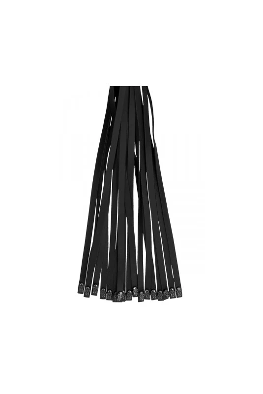 Fouet noir en simili cuir et mĂ©tal, ornĂ© de petits cranes Ă l’extrĂ©mitĂ© de ses lanières.