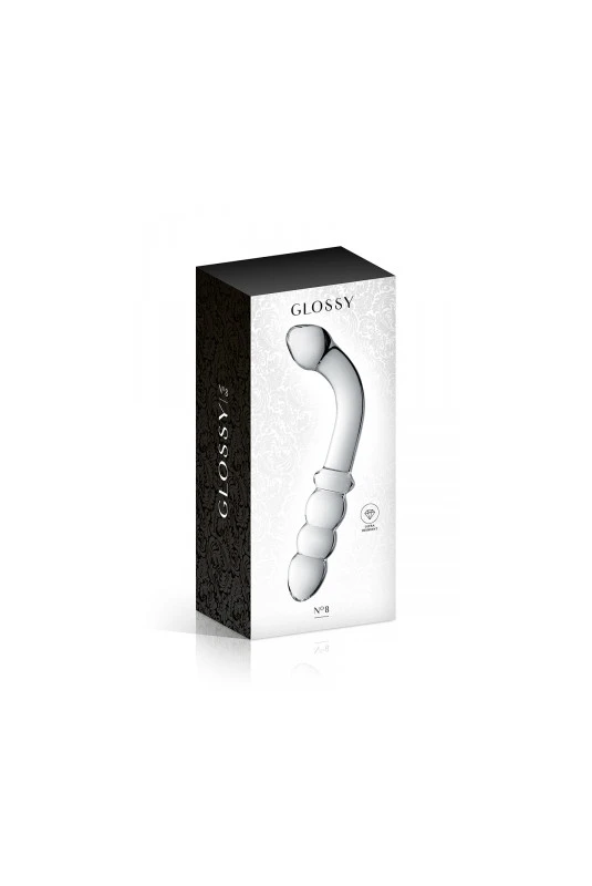 Dildo en verre incassable translucide, coudé et utilisable par les deux extrémités pour varier les stimulations.