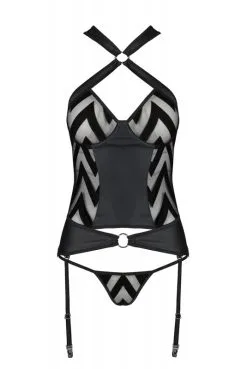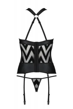 Ensemble guêpière et string Hima en tulle décoré de chevrons et faux cuir, par Passion Lingerie.