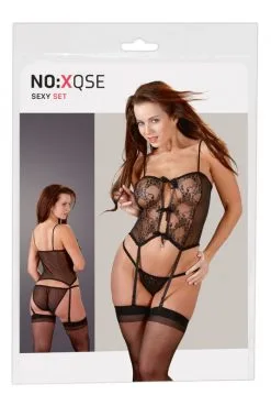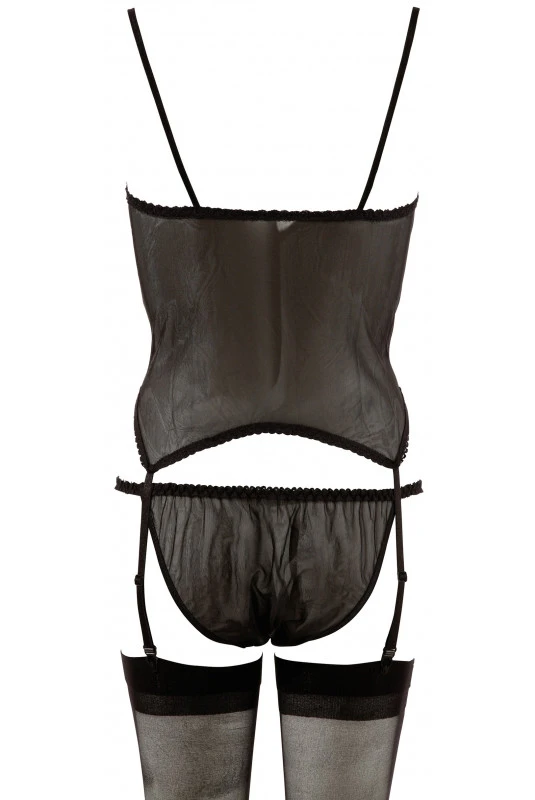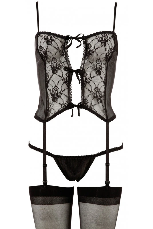 Guêpière porte-jarretelles avec sa culotte en résille et ces bas assortis de couleur noire