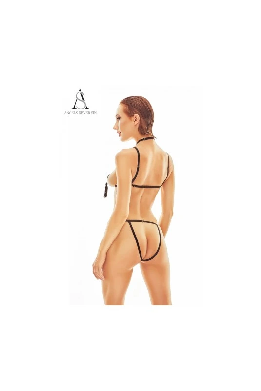 Ensemble deux pièces top seins nus avec collier intégré et culotte fendue harnais.