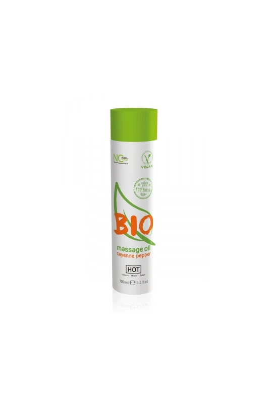 Huile de massage BIO et Végan au parfum érotique et raffiné piment de Cayenne, par HOT. Flacon de 100 ml.