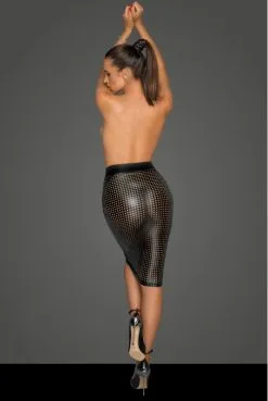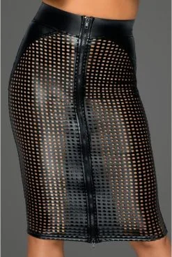 Jupe aux genoux en wetlook ajouré de carrés découpés au laser, avec un zip ouvert devant sur toute la hauteur.