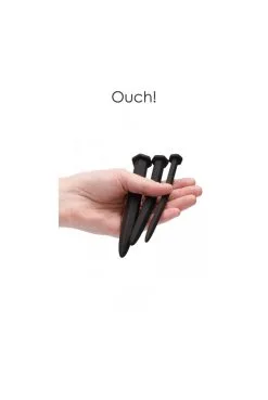 3 sondes urĂ©trales en forme de grands clous en silicone Ă pointes hexagonales, longueur totale 15,5 cm, diamètres 0,9 – 1,3 et 1,65 cm.