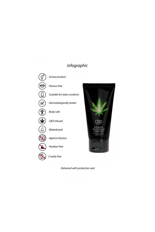 Lubrifiant intime Ă base d’eau et de CBD, avec effet relaxant, longue durĂ©e et fort pouvoir de lubrification, tube de 50 ml.