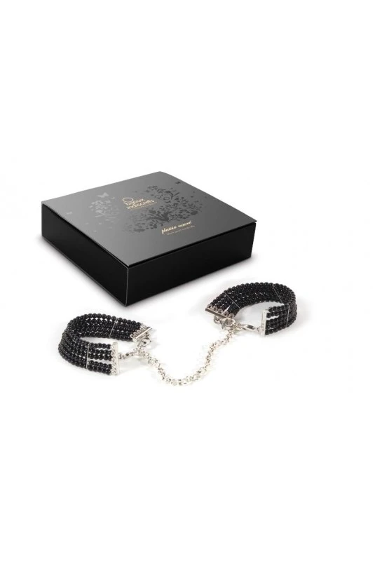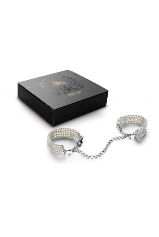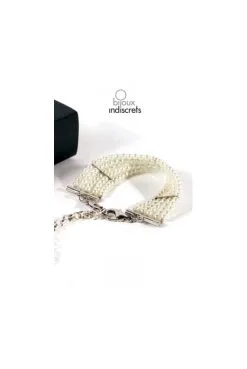 Deux bracelets de perles nacrées reliées par une chaîne, une sensualité raffinée.