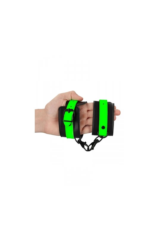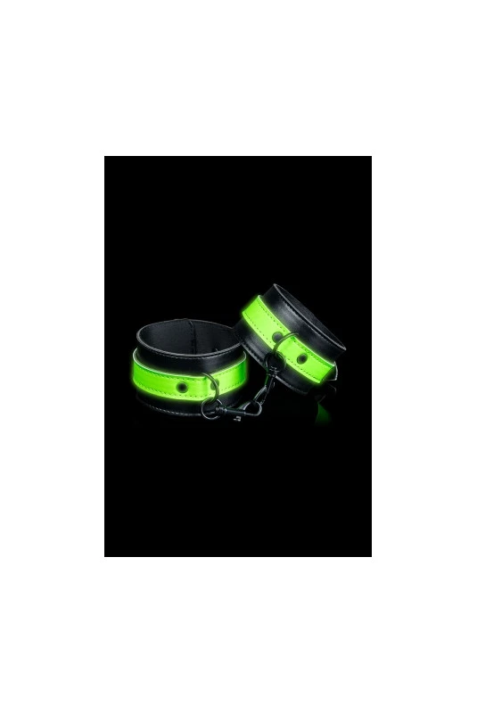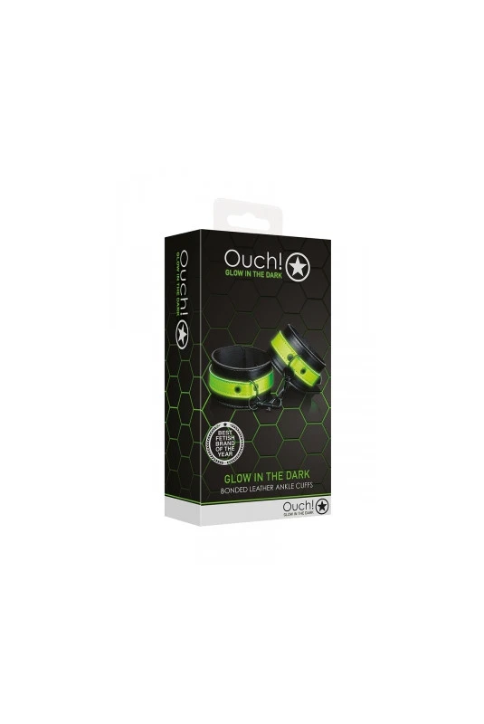 Paire de menottes de chevilles réglables qui brillent dans le noir en cuir reconstitué et métal, par Ouch!