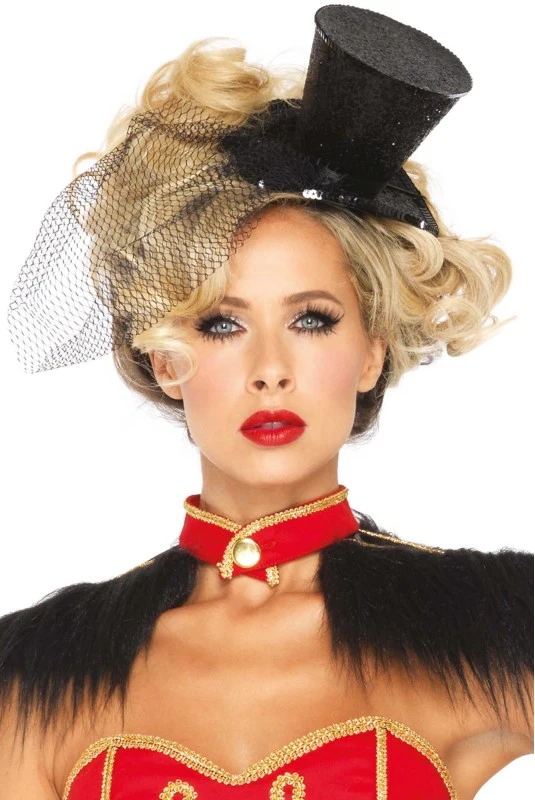 Mini chapeau haut-de-forme brillant avec voile en dentelle. Maintien par 2 pinces Ă cheveux.