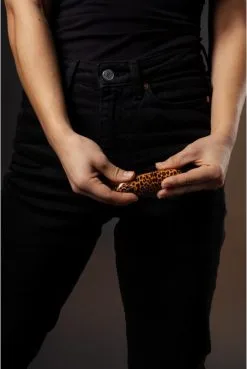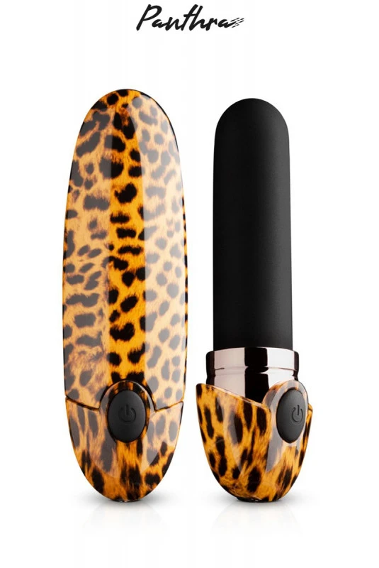 Puissant vibromasseur rechargeable couleur panthère, ressemblant à un rouge à lèvres coloris panthère et sa pochette de transport assortie.