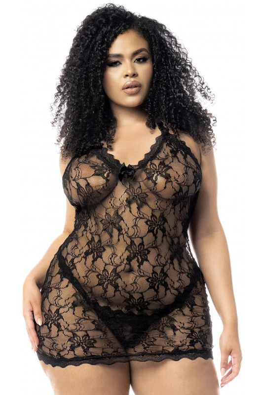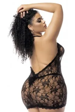 Nuisette Grande Taille Dentelle Florale Noire Dos Nu et String Assorti