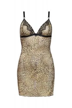 Délicieuse nuisette en tulle fluide imprimé léopard, brodée sur le décolleté.