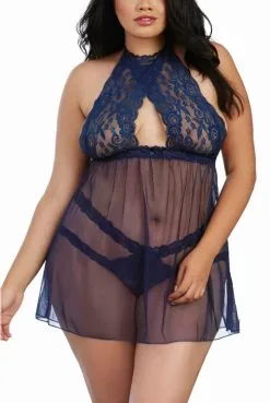 Nuisette Transparente Grande Taille Bleue Fine Maille et Dentelle