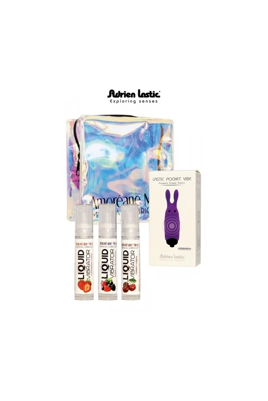 3 lubrifiants stimulants (fraise, fruits rouges, cerise) et 1 mini vibro violet dans un superbe mini sac estival.