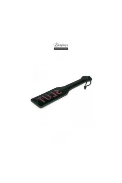 Solide tapette Ă fessĂ©e noire en cuir portant l’inscription « Slut » sur le battoir.