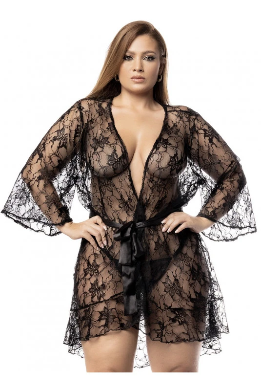 Peignoir Déshabillé Court Grande Taille Dentelle Noire Transparente et String Assorti