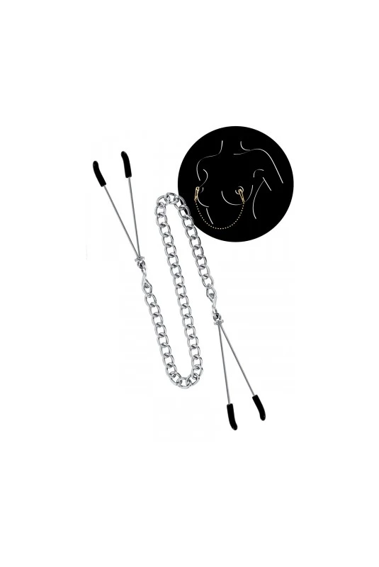 2 pinces à seins reliées entre elles par une chainette en acier argenté, pour lui procurer de délicieuses sensations.