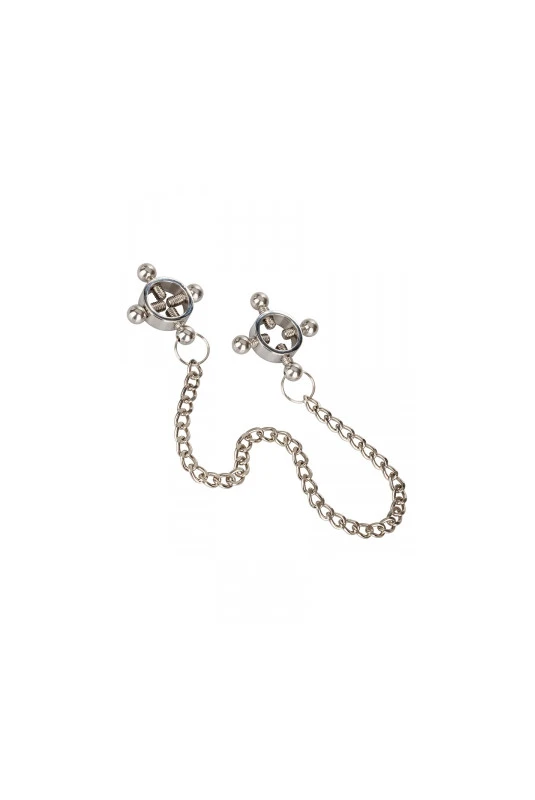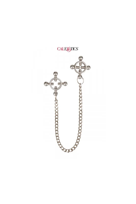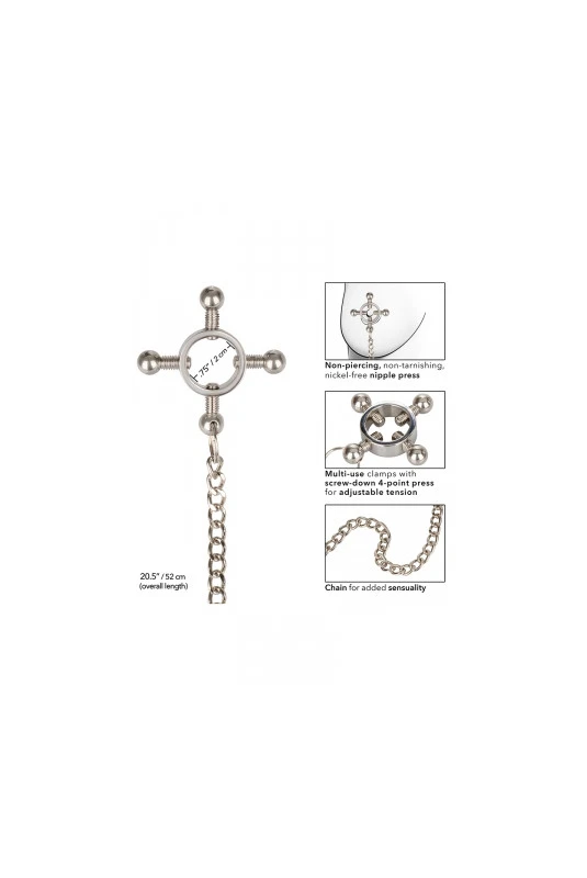 2 pinces BDSM multifonctions entièrement réglables, avec serrage par 4 points et chaîne acier inoxydable de 52 cm.