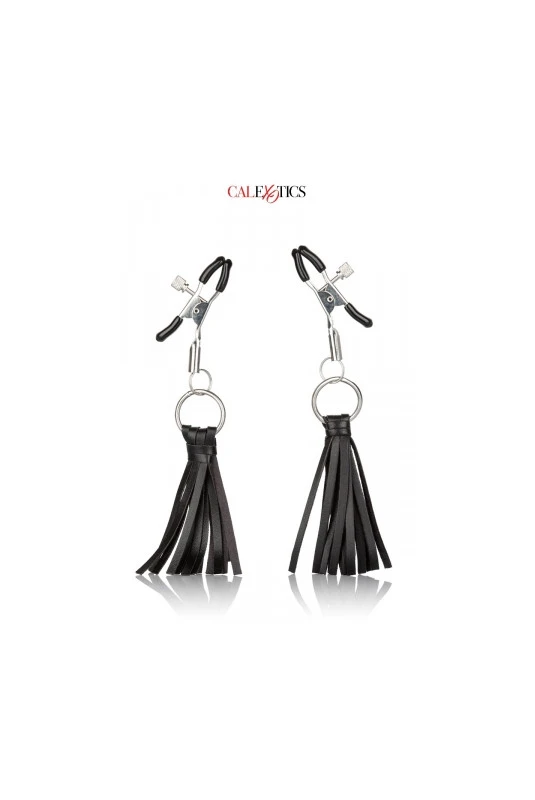 Paire de pinces ajustables en métal avec pendentifs pompons en simili cuir,pour les tétons, les lèvres ou le clitoris.