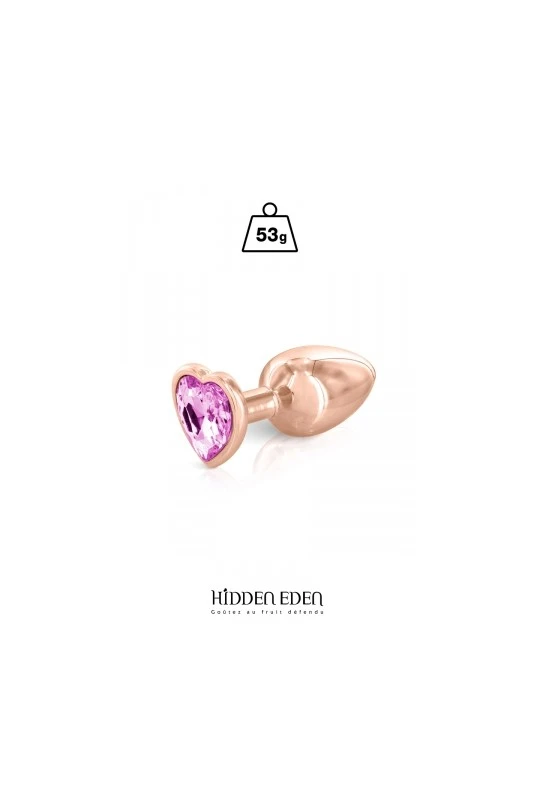Plug anal en aluminium rose gold d’une longueur de 7 cm et d’un diamètre moyen de 2,8 cm. Son bijou strass rose est en forme de coeur.