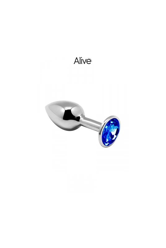 Plug anal en mĂ©tal dÂ’une longueur de 8 cm et un diamètre de 4 cm dĂ©corĂ© d’un strass bleu.