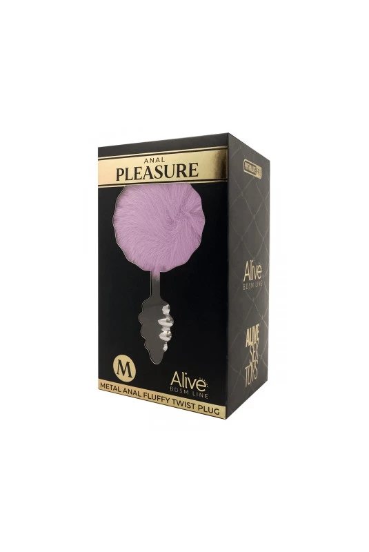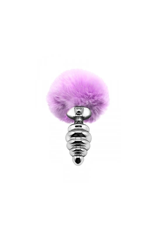 Plug anal en mĂ©tal, modèle Medium 8 x 3,4 cm, forme annelĂ©e, surmontĂ© d’un pompon mauve en fourrure synthĂ©tique.