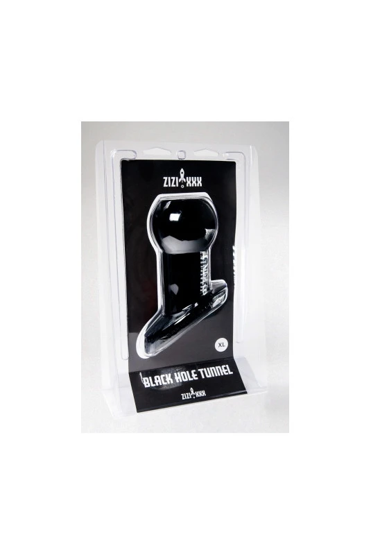 Plug anal noir en TPR, taille Xlarge, transpercé par un tunnel sur toute sa longueur.